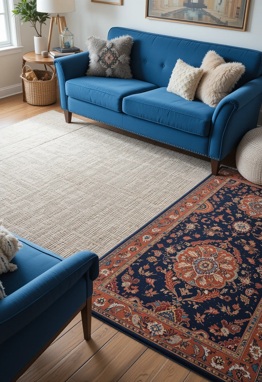 Neutral rugs like beige, gray, or off-white work well with a blue couch, but you can also experiment with Persian or geometric designs for added personality.